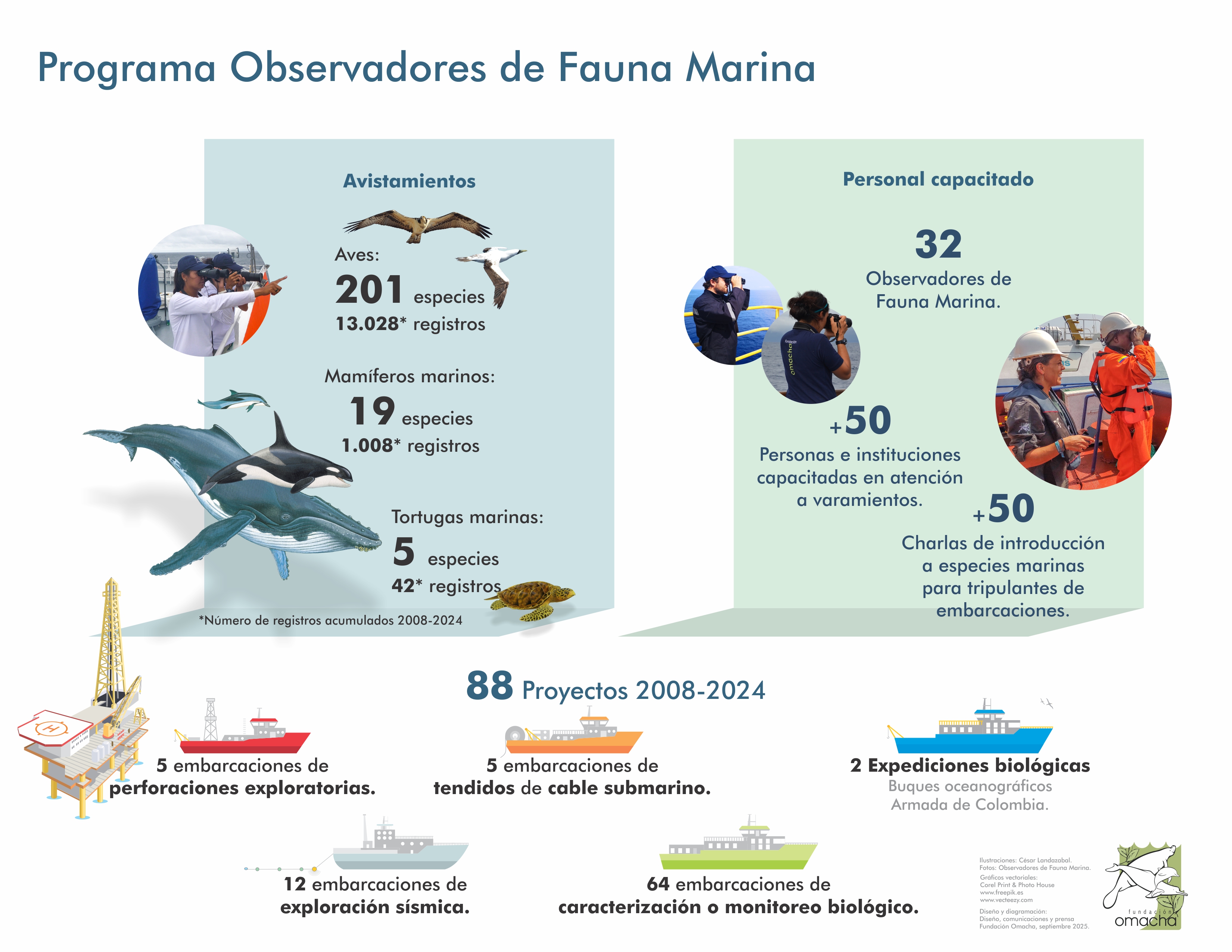 El programa de Observadores de Fauna Marina se ha desarrollado gracias a alianzas con entidades públicas y privadas y las comunidades locales bajo una metodología estandarizada, y colecta información sobre la presencia y distribución de especies de cetáceos (delfines y ballenas), tortugas, aves y peces marinos y embarcaciones pesqueras, utilizando diferentes plataformas de oportunidad como buques de investigación, de control y vigilancia, de prospección sísmica, plataformas petroleras y embarcaciones pesqueras que operan en aguas colombianas, con el fin de:
